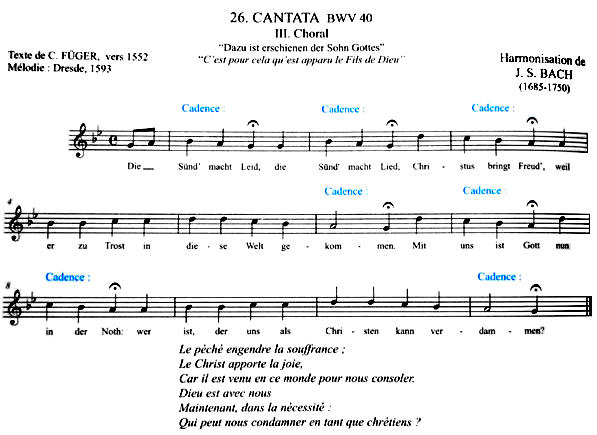 次はバッハのカンタータBWV40 III.コラール「神の子の現れたまいしは」を用いて、カデンツのエクササイズ。16世紀末に作曲された既存の単旋律コラールにバッハが和声付けしたカンタータで、11小節に5種類7つのカデンツが登場します。CDを聴きながら譜面(単旋律)にカデンツの種類を書き込んでいきますが、コラールを教材に用いることで和声進行が手に取るように分かります。最終小節はピカルディの三和音。15世紀フラマン人であったピカルディの横顔が紹介されました。