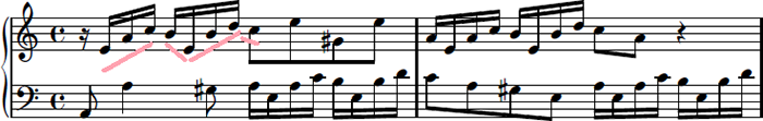さらに、カノン風の出だしはバッハの《2声のインヴェンション》第13番に見られるジグザグ主題旋律と動きが非常によく似ています(和音構成音も同じです)。