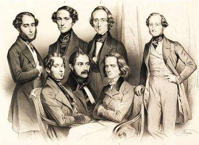 後列左より順に、ローゼンハインJ. Rosenhain(マンハイム)、デーラーTh. Döhler(ナポリ), ショパンF. Chopin(ワルシャワ近郊のジェラゾヴァ・ヴォラ)、 タールベルクS. Thalberg(ジュネーヴ), 前列左より順にヴォルフEd. Wolff(ワルシャワ), ヘンゼルトA. v. Henselt(バイエルン), リストF. Liszt(ライディング)。