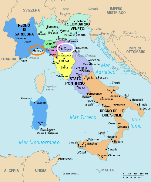 下図は1843年時点のイタリアの地図(Wikipediaより転載)ナポレオン失脚後、ウィーン会議を経て以前の小国分立状態へと戻った。赤い丸がガンビーニの生地ジェノヴァ、白丸はゴリネッリの生地ボローニャ。ジェノヴァはサルデーニャ王国、ボローニャは教皇領に属していた。