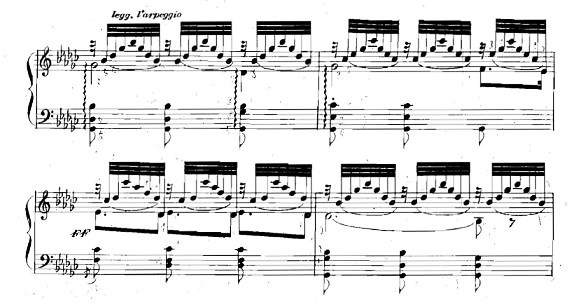彼の演奏技巧は非常に大胆でありながら、優美な歌唱的旋律を際立たせるもので、それは左手のみの場合においても探究されています。下の譜例は上に挙げた作品106の一節です。