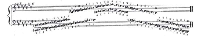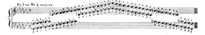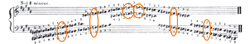 このメソッドには、現代人が「ハノン」で親しんでいる音階以外に、7つ以上の♯がつく長音階が3つ(嬰ト長調、嬰ニ長調、嬰イ長調)、7つ以上の♭がつく長音階が一つ(変ヘ長調)、同じく短音階が一つ(変ニ短調)掲載されています。