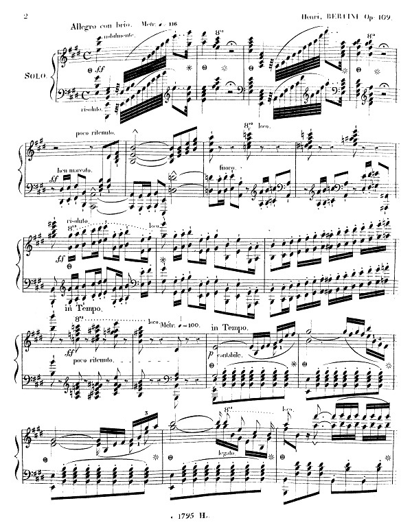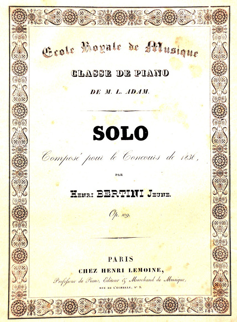 パリ音楽院でピアノ科女子クラスの教授だった尊敬すべきルイ・アダン※1は、ベルティーニ対して好感を露わにしていたが、それはアダンが作曲家としてのベルティーニの美質を高く買っていたからだった。この大家の作品はかなりの数に上る。作品番号にして200近く、その大部分がきわめて大きな重要性をもっている。ベルティーニはその音楽的構想が自然で率直な点からして、旋律的な作曲家の流派に与している。常に上品な原初の着想ははっきりと提示され、決して凡庸な繰り返しをあれこれとごまかすような凝った節回しになることはない。もったいぶったところや気取り、忌むべきわざとらしさは微塵もなく、雄弁術という点にかけては巨匠音楽家、つまり己の才能に静かなる確信を持ち、自由な音楽の運び方で自らの着想を表明する大家の特徴を備えている。こうした音楽の運びは、楽曲の主題についての完全な知識と目的への直接的なヴィジョンを持つことによってのみ生み出すことができるものなのだ。