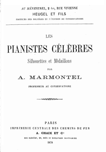 1816年生まれのマルモンテルは、生前ショパンやリストをはじめ著名なヴィルトゥオーゾたちの演奏を間近に聴き、恐らくは会話を交わしてその記憶を晩年、数冊の書物に記録しました。マルモンテルはいくつもの書籍を出版しましたが、「列伝」シリーズは次の3冊がから成ります。