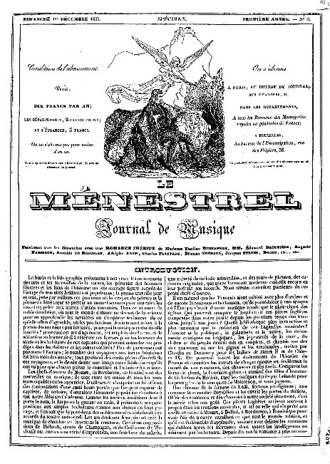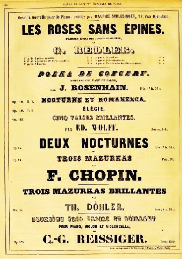 楽譜出版社はおまけに、音楽関連図書はもちろん、音楽の専門雑誌を出版したり、出版社主催の演奏会を催すこともありました。定期刊行の音楽雑誌に関して特に有名なのは、19世紀のフランスを例に挙げると、ウジェール社の『ル・メネストレル』紙(1833年創刊)、シュレジンガー社の『ガゼット・ミュジカール』紙(1834年創刊)(後に『ルヴュ・エ・ガゼット・ミュジカール』)、エスキュディエ社の『フランス・ミュジカール』紙(1837年創刊)などが挙げられます。これらの雑誌上で、ショパンやリストを始め、数々の作曲家の新譜が紹介され、時には激賞の、時には辛辣な批評の対象となりながら、人々の間に知れ渡っていったのでした。