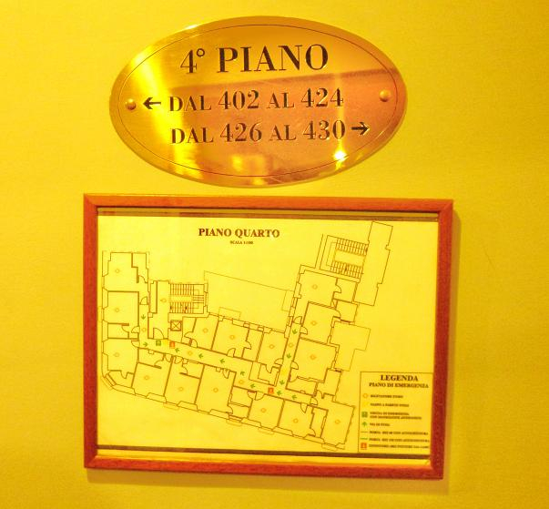 写真はヴァイオリンの街、クレモナのホテル4階の表示。楽器のピアノはどこにもありません。