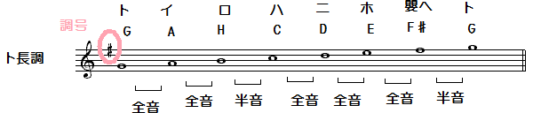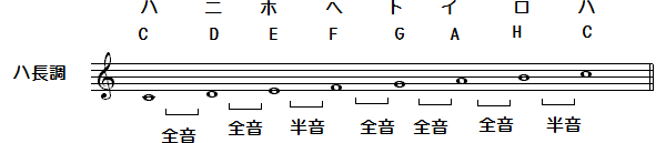 これは「ハ(=C)」の音から始まるハ長調の音階です。「5つの全音と2つの半音」をこの順で並べたのがいわゆる長調の音階(長音階)ということになります。長音階は「ハ音」以外に、1オクターヴを構成する12の半音のどこから始まってもいいので、12種類の長音階があることになります。たとえば、「ト音」から始まれば「ト長調」です。