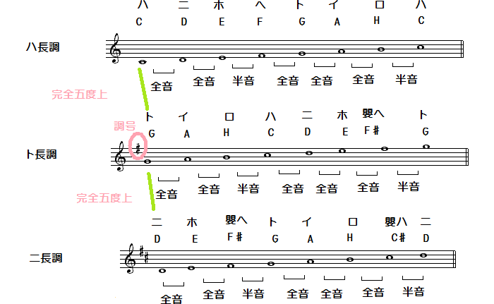 では♯が4つの長調は何調?というと、「ニ音」からさらに二回5度上に上がればいいわけですから、「ニ→ホ→嬰ヘ→ト→イ」と「イ」まで上がれば♯3つ、さらに「イ→ロ→嬰ハ→ニ→ホ」と「ホ」まで上がって、答えはホ長調ということになります。
