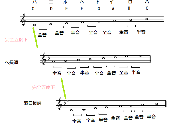 そこで、今度は♭系の音階が登場します。基本的な考え方は♯系と同じですが、♭の場合は調号の♭がひとつ増えるたびに中心音は完全5度ずつ「下がって」いきます。調号がつかないハ長調からみれば、調号に♭が一つつく音階はハ音から「ハ→ロ→イ→ト→ヘ」と5つ下がってヘ長調です。この「へ音」からさらに5度下がると♭二つの調、すなわち「変ロ」長調になります。なぜ「変」がつくかというと、すでに調号には♭が一つついているからです。このプロセスを繰り返していくと、♭系の長音階では次の7つの音階が得られます。ヘ長調、変ロ長調、変ホ長調、変イ長調、変ニ長調、変ト長調、変ハ長調。