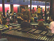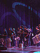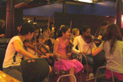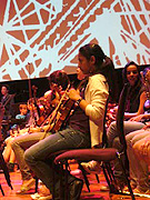 リハーサル2日目には、これらの3つのプロジェクトが集まり、お互いの作品を聴きあう。弦・管を中心にしたアンサンブルの子たちは、腰に大きなドラムを下げ、鮮やかなバチさばきとステップで華やかに演奏するドラムの集団の迫力満点の姿に目を見張る。が、みるみるうちに歓声をあげ、生き生きとした顔で見つめ、うずうずしだす。負けられない!と、お互いの演奏でさらに触発されたようだ。