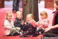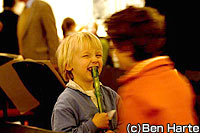 ホールの中へ4曲目は『キング・デービッド』。ほんの少しお話をして歌を披露していると、ゆったりした曲の間に小さな子どもはそろそろ我慢ができなくなり、お母さんに話しかけたり、歩きだしたり。そろそろ時間のようだ。「ではみなさん、今度は一緒に歌ったり踊ったりしましょう。下の階に5分後に集合!」と声をかけて前半を終了。お話を含め約15分の短いコンサートだが、幼児には十分の長さだ。
