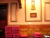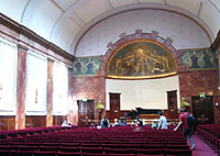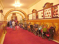 入口にはベビーカーがいっぱいこの日の「チェンバー・トッツ」は、2~3歳向けと3~5歳向けの2回に分けて1時間ずつ行われた。開始近くなると、荘厳なウィグモアホールの建物に、子どもを抱いたお父さんやお母さんが次々とやってきて、ホールの入口は見るうちにベビーカーでいっぱいになった。入口では今日のプログラムと、座席を高くするクッションを配っている。各回の定員は約35名。申し込み数はさらに多く、もちろんホールの収容力はまだあるのだが、インタラクティブな効果を求めるには、ある程度人数を絞る必要がある。