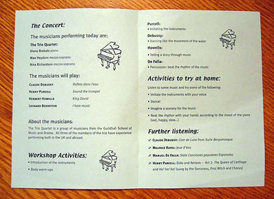 チェンバー・トッツ当日のプログラム「チェンバー・トッツ」の圧倒的な支持の中で、ホールに足を運ぶには遠い地域や、保育園からの需要も増えて来た。そこで2000年には「チェンバー・トッツ・イン・コミュニティ」という、地域へ出かけていくプロジェクトも始まった。開始以来9年間で、ロンドンの11の市区、のべ51の幼児教育機関において実施され、1000人以上の幼児が参加した。加えて2009年は、ウェストミンスター区5つ、ハックニー区4つの保育園や児童センターで実施されている。これらの施設は公募ではなく、ウェストミンスター区議会、ハックニー区音楽教育機関などのパートナーと注意深く選んでいる。