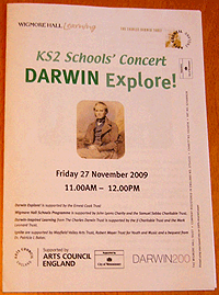 チャールズ・ダーウィン2009年はイギリスの自然科学者チャールズ・ダーウィン(1809-1882)の生誕200年にあたり、自然史博物館やテレビなど各方面で「ダーウィン200」にちなんだ催しが企画された。ダーウィンは世界的な自然科学者であるとともに、イギリス人にとって自国の歴史を代表する偉人なのである。ウィグモアホールでもスクールコンサートのテーマにダーウィンを取り上げることになった。