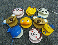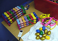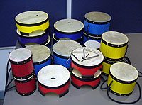 ミニドラムもたくさん用意言語の発達も促される。小さいマラカスを歌にあわせて振りながら、頭と言うとマラカスを頭につけるというように、鼻、指先、つま先...と身体の部分をゲームのように覚えたり、「十人のインディアン」の曲にあわせて人形の数を数えたりと歌詞に色々な言葉や数を組み込む。「歌では、普通にしゃべるよりもゆっくりと言葉を発します。それを繰り返すことで子どもたちは早く言葉を覚え、話す能力を身につけるのです。」とヴァネッサ。