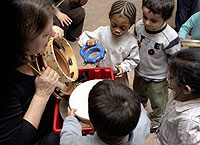 このワークショップでは、音楽を使って子どもの発達を助ける要素が他にもたくさん盛り込まれている。例えば身体の発達。1歳から5歳までの幼児は、ようやく歩きだせるようになってから、ジャンプしたり走ったりスキップしたり、タイミングにあわせて手を打ち、放ったものをキャッチできるようになる。ヴァネッサは3つの年齢グループごとに音楽にあわせた身体の動きを巧みに変える。1歳から1歳半のクラスでは、その場で足踏みしたり膝をたたいたり、親と手をつないで部屋の中を歩いたり。真ん中のクラスでは膝を曲げたり片足で立ったり走ったり。5歳までのクラスになると、木琴やピアノのテンポにあわせて走ったりスキップしたり、音楽が止んだら止まったりできるようになる。