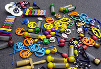 ワークショップの後半、ヴァネッサは輪の真ん中におもちゃ箱をひっくり返した。中からはカラフルなマラカスや卵型のシェーカー、ミニ木琴、動物の顔のカスタネット、ミニ太鼓、ギロなどたくさんの打楽器がこぼれ落ちる。小さい年齢の子どもたちは一目散に楽器の山に寄って手に取り、音を鳴らしだす。大きい年齢のグループの子たちは、目を光らせて見つめるもののすぐには駆けよらない。「緑の服を着ている子、最初に選んでいいよ」と言われると、他の子はちゃんと待っている。この年齢の子たちは他の子とおもちゃを共有したり順番を待ったり、片づけを手伝ったりすることを学び始めているのだ。
