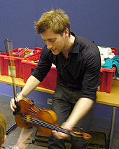 LSOのヴァイオリニスト、マシュー・ガードナー好きなだけ楽器で遊んだ後は、今度は静かな音楽をかけ、親子で一緒に床に寝転がって静かに聴く。「子どもたちを興奮させるのは実は簡単。静かに落ち着かせることの方がずっと難しいのです。ですから音楽を使って落ち着かせることも教えます。帰りに子どもたちが興奮したままだと親は大変ですしね。」とヴァネッサ。前半5回のセッションでは録音の音源もよく使う。ヴァネッサはその時の子どもの様子を見て、どういう曲をかけるか注意深く選ぶ。ヴァネッサは言う。「生の音楽がいいのはもちろん。でも生演奏しかだめというのではありません。実際の生活では生演奏は毎日聴けませんから。録音の音源を使ってデモンストレーションすることで、親は音源の使い方を知り、家でも実践しやすくなるのです。」
