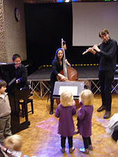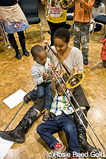 当日のバービカンセンターは、親子連れで活気あふれていた。入口すぐの所には、道行く人が物を飾って楽譜にみたてたインスタレーションがあったり、階下のオープンスペースでは色とりどりの素材を使って楽器を作る親子たちの姿、中二階からはサックスやクラリネットでジャズにトライする若者の演奏と声が、と賑やかだ。この日センターの中は、大きく4つのセクションに分かれていた。「Have a go(やってみよう)」「Make Zone(つくってみよう)」「Explore(たんけんしよう)」「Watch and Listen(見よう、聞こう)」。