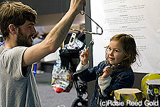手作りの楽器で遊ぶ「Make Zone(つくってみよう)」では、自分で楽器を作ってみて、どうやって音が出るのか、そのしくみを発見しよう、というもの。今回は「パーカッション・ビュッフェ」「ギターづくり」「オーボエづくり」の3つ楽器づくりワークショップが行われた。こちらは素材代2ポンドで予約参加できる。「パーカッション・ビュッフェ」では、ビュッフェ台にドラムを作るための素材が、枠となる「フレーム」、たたく「膜」、共鳴する「シリンダー」、バチ類、それに音に変化を与えるものなど、種類ごとにそれぞれ色々な素材や形、大きさのものが置いてある。親子でそれぞれから好きなものを選んで組み立て、飾り付け、持ち帰ってよいというユニークな企画。その他、空き箱を使ったギターづくりや、ストローを使ったオーボエづくりも少し上の年齢の子に人気で、真剣に作業をしていた。