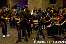 観客を誘導するドラム隊1月29日当日には、18時から30分間、ロビー階のフリーステージにおいて、フューチャー・バンドによるオリジナル音楽の演奏が行われた。パフォーマンスが終わると、観客を誘導するように、ステージ横からジョー率いるドラム隊が列を組んで演奏しながら地下のスペースのクラブステージへと移動し、ファッションショーへバトンタッチ。ファッションショーは、特別にデザインされたステージ上で、オリジナルの音楽と照明にのって、生徒たちがデザインした服を身にまとったダンサーたちがそれぞれの服を見せるためのオリジナルの振付のダンスで約30分間のダンスステージを披露した。ステージを見ていた服をデザインした生徒たちからは、歓喜の声援が飛び交った。