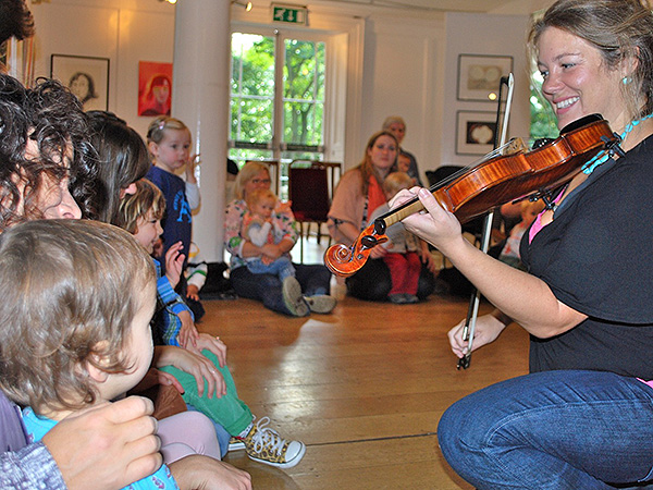 「みんなにごあいさつしたから、楽器にもあいさつしようね!」と、「ハロー、ヴァイオリン、ハロー、ピアノ」と歌ってあいさつすると、ヴァイオリンが出てくる。クレアがヴァイオリンを肩にはさみ、短い曲をいくつか弾くと、それまで色々な方向を見ていた赤ちゃんたちも、驚くほど、音の出てくる方向をじっと見て、大きく動く弓の動きを目で追っている。その様子を見たクレアは、ひとりひとりの赤ちゃんの目の前を歩き、時にかがみこみながら弾いて回った。目の前に楽器が来ると、自然に手が出る子どもたち。するとクレアは、その子が触ろうとした弦をポン、とはじいてみたり、間近で見せてあげたりする。