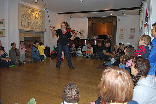 今日はいつもの先生がお休みのため、創始者で今は全体のマネジメントをしているクレアが自らヴァイオリンを片手に、代理としてやってきた。ミニ・モーツァルトでは他に、フレンチホルン、オーボエ、サクソフォーン、チェロ、バスーン、トロンボーン、ギター、アフリカの楽器コラなどの楽器を演奏する先生がいる。同じ先生がクラリネットとフルートを週替わりで吹いてくれることも。それらの楽器の先生が楽器の演奏から歌やお話などのアクティビティ全てを率い、ピアニストが、ピアノやキーボードで伴奏を務める。
