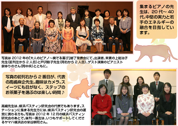 | 主な活動実績 | ![]() 2012年は、大人のピアノ初心者を対象にしたワークショップ 「大人のピアノ・奏でる喜び」を開催。2014年第3回開催、2014年「鑑賞教室」開催。 |