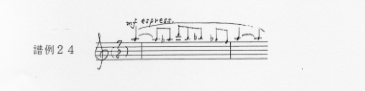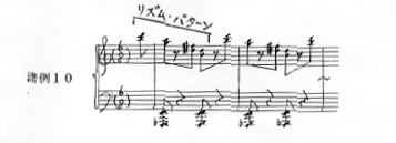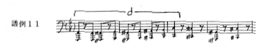 その後、24小節目で叩きつけられる様なリズム・パターン(譜例10)は、45小節目で半音階上行音型モティーフd(譜例11)になって現れ、そのモティーフdは、65小節6拍目で、リズムを変えた逆行の形モティーフd´(譜例12)になって現れる。