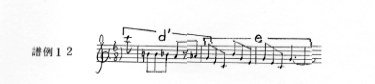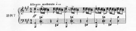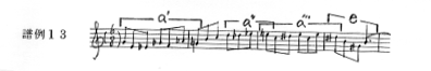 また、この半音階的なモティーフd´と対照的な後半の分散和音音型のモティーフeは、モティーフaの変奏と結び付いた71小節目の旋律の終結部分(譜例13)に現れている。