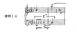 さて、76小節目ではモティーフcのリズム・パターンによるquasi Timp.と書かれたモティーフ(譜例14)が現れるが、これは第2主題のモティーフを予告するものである。