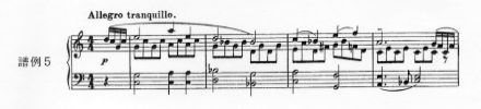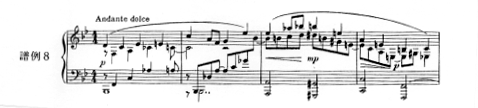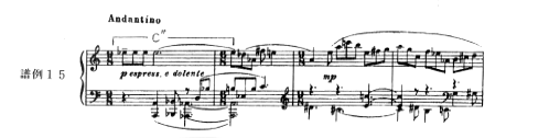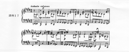曲は、冒頭の内声部にみられるcantabileと書かれた半音階的な主題旋律(譜例17)が短いモティーフを加えて転調、発展していく。