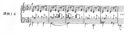 その後、徐々にテンポを上げて展開部に入るが、ここではこれまでの数々のモティーフが巧みに使われ、激しい楽想とともに高度な技術を要する楽章のクライマックスを築いている。その中でも、269小節目からの右手のリズム・パターン1の下に第2主題が拡大して現れているのは興味深い(譜例16)。
