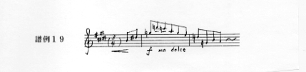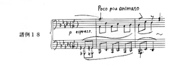 その後、31小節3拍目から新しい旋律(譜例18)が現れて、12小節3拍目からの跳躍音程による表情をもった旋律(譜例19)とともに装飾的な変奏部分に入り、楽想の頂点を迎える。