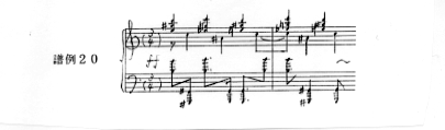 ここでは、56小節目から和音の響きによって鐘の響きと同様な効果を狙った音型(譜例20)が現れるが、これはラフマニノフやムソルグスキーなど、ロシアの作曲家が使う得意な手法の一つである。演奏においてもそれぞれの響きが、全く異なった鐘の様に区別して聴こえるために、音色を変化させて弾くことが望ましいといえる。