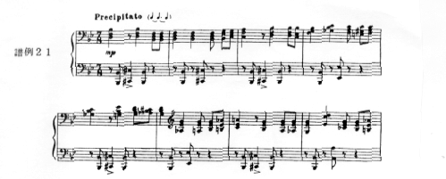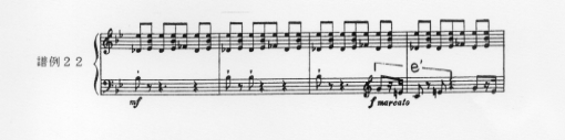 まずAの部分(譜例21)は、左手が変ロの音をベースに、嬰ハ音にアクセントを置く2小節を1つとした一定のリズム・パターンでできており、その上に右手が3和音による冒頭のテーマをさまざまに変化をしながら進んでいく。