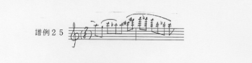 また、それに続く87小節2拍目からの旋律(譜例25)も、第1楽章第1主題に続くモティーフb´を含む第1楽章7小節2拍目からの旋律が形を変えて現れたものである。