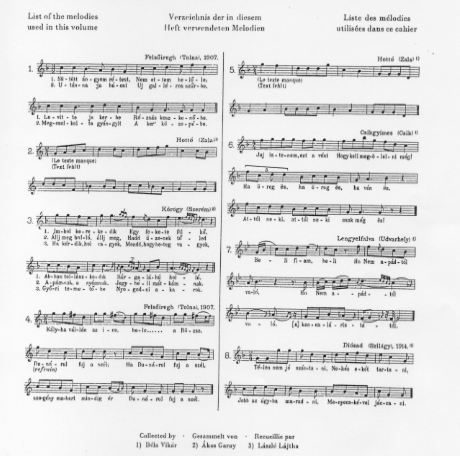 『ハンガリー農民歌による8つの即興曲』Op.20に使われた民謡譜と歌詞訳をここに一覧にして紹介する。歌詞訳は下記の著書からの引用と、民族音楽研究家である横井雅子氏のご協力により手に入れることができた。