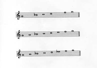 (2)と(3)での2度音は通常a又はa♭、6度音はe又はe♭であり、もとの五音音階から、ドリア、エオリア、又はフリギャ音階に変わる。」