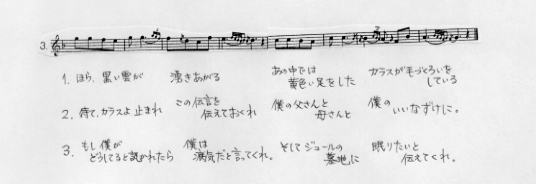 2.待て、カラスよ、止まれ、 この伝言を届けておくれ 僕の父さんと母さんに、 僕のいいなずけに。 |
