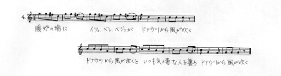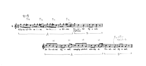 「もう一つ別の種類の五音音階の変化が次第に生まれて来ていて、それはすなわちI地域〔ドナウ河以遠の地域をさす〕に特徴的である〔まさしく第4曲は「ドナウ河」を歌っている〕。すなわち、3度音、あるいは3度音と7度音の両方のピッチが高くなるものである。この上昇は時には半音に満たないもので、結果は中間的な3度や7度になる。〔中略〕その結果、長音階のように〔中略〕なる。それでもなお、どの音階にも五音音階的構造が非常にはっきり残っているので、その根をみあやまることはない。」