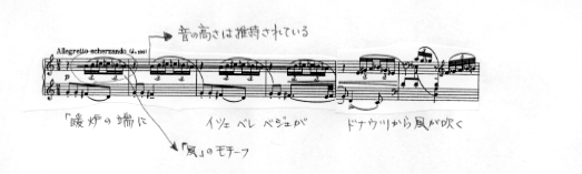 〔構成〕民謡はTempo giustoの場合、4行詞の曲が使われていたが、これは2行詞が終わった所で歌詞のRefrainが入るという特殊なものである。その為、1フレーズが6小節単位となりそれが標語にあるscherzandoの性格を感じさせる。