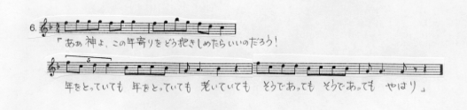 が、一転して(2)では短2度のざらついた和声がつき、装飾はヒステリックに緊張を高める。ここでは6aの歌詞「年寄りをどうやって抱きしめたらいいのだ」という内容からの、女の不満、でもどうしようもない嘆きといったものがあるのだろうか。