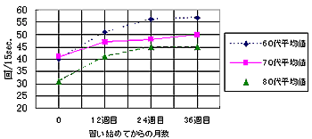 15秒間に何回打鍵できるかを測った結果、個人差はあるものの確実に進歩することが解った。その変化はどの年齢層においても認められた。