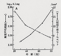- 加齢に伴い焦点調節能力が衰え近方視力が低下する。(湖崎 1989)