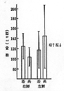 起立している床の右脚側が上方に、左脚側が下方に急に移動し体を側方に傾けたときに右の前脛骨筋と左緋腹筋に出現する長潜時反射の潜時。若年齢者群ではこれら両筋の反応がほぼ同時に起こってうまくバランスを保っているが、高齢者群では反射性の反応の起こる時間がずれてしまっている。