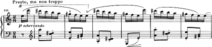 ブラームスの作品では、冒頭からPrestoの指示があることは少なく、曲途中で相対的に使われる場合の方が多い。Prestoは、ブラームスにとって単純に速度を意味する言葉であったようだ。