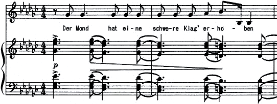 【譜例2】第Ⅰ集第7曲〈月は深い嘆きを心に抱えて〉mm. 1-2 このようなメロディーとリズムのモティーフの反復は、ヴォルフが 1875年より作曲を始めた初期のピアノ曲(※12)を皮切りに、中期に向けて発展させた作曲技法とも合致している。 この技法は、第Ⅰ集の半年前に作曲が終わり、また第Ⅰ集以上に歌唱パートにおいて同音反復が顕著である《スペイン歌曲集 Spanisches Liederbuch》の《宗教的な歌曲集 Geistliche Lieder》(1889-1890 作曲、全10曲)(※13)のピアノ・パートにおいて、各歌曲の90%前後をひとつのモティーフが反復されるという形で最大限に発揮された(※14)。つまりこの歌曲集では、歌唱パートでは同音反復、ピアノ・パートではモティーフの反復と、種類の異なる反復の二重構造が形成されているのである。