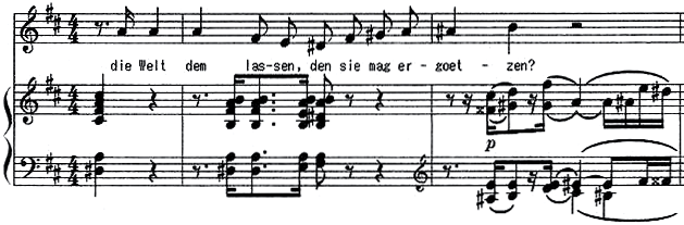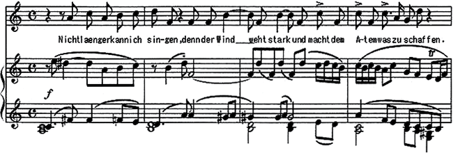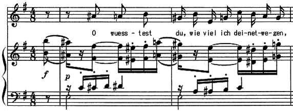 前項までに述べてきたように、歌唱パートに同音反復が多用されている第Ⅰ集の対象曲では、歌唱パートでは同音が、そしてピアノ・パートではメロディーとリズムのモティーフが変更を伴いつつ反復され、種類の異なる二重の反復がリートを構成している。一方で、 第Ⅰ集の対象曲の中には、歌唱パートに同音反復が多用されている部分とそうでない部分が明確に分かれているリートもあり、このうち、リートの同音反復が多用されない部分で は、ピアノ・パートは歌唱パートと共に動くのではなく、歌唱パートが奏される部分ではピアノに休符が多く、歌唱パートに休符が入るとピアノ・パートが演奏されるといった掛け合い的な形になっている。この形は、リートの導入部に用いられていることから、オペラのレチタティーヴォ的なイメージで作曲されたとも捉えられるだろう。
