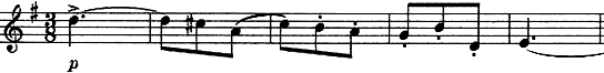 第二点のメロディーの類似としては、《イタリアのセレナーデ》の主旋律が第Ⅱ集第20曲〈もうこれ以上歌えない〉と第21曲〈ちょっと黙って〉に関係しているのではないか、 というエリック・サムズ Eric Sams の指摘(※21)に始まる。この 2曲の詩は、出典の『イタリアの歌の本』では連作詩ではないが、第20曲は男性が強風の吹きすさぶなか、愛する女性のために歌い、第21曲はこの詩を受けて、女性がこの男性の歌より、ロバの歌うセレナーデの方がましと強烈に拒否するよう、ヴォルフは 2つの詩を並べ、物語性を出している。 そしてサムズは、《イタリアのセレナーデ》の主旋律(【譜例 6】)が、ヴォルフのイメージする本来のセレナーデで、これを第20曲〈もうこれ以上歌えない〉のピアノ・パートの右手(【譜例 5】)が、下手なセレナーデのメロディーとしてパロディしたと考えているようである。このパロディ・バージョンのメロディーは、第21曲〈ちょっと黙って〉のピアノ・パートにもほぼ同じ形で使われており、さらにサムズの指摘にはないが、筆者は、男性が実らない恋心を愛する女性に訴える、次の第22曲〈ああ知っているのか〉にもさらに変形されて使用されている(【譜例 4】の右手のメロディー)と考える。そしてこの第20曲から第22曲は、前節で考察対象として取り上げたように、歌唱旋律に同音反復が少ない(または全くない)ことから、第Ⅱ集の傾向を顕著に示す曲であった。